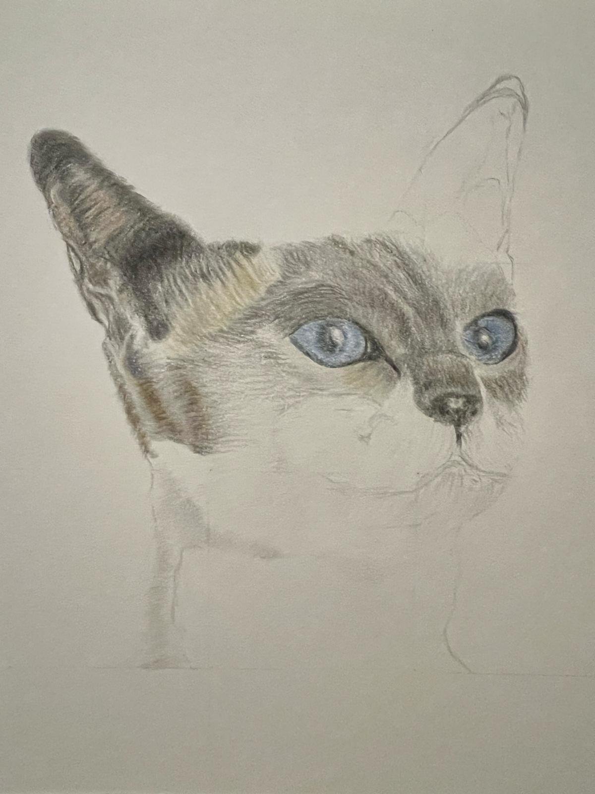 I spent a long time getting his eyes to the perfect shade of blue and enjoyed using brown ochre coloured pencils around his ears to complement his colouring.